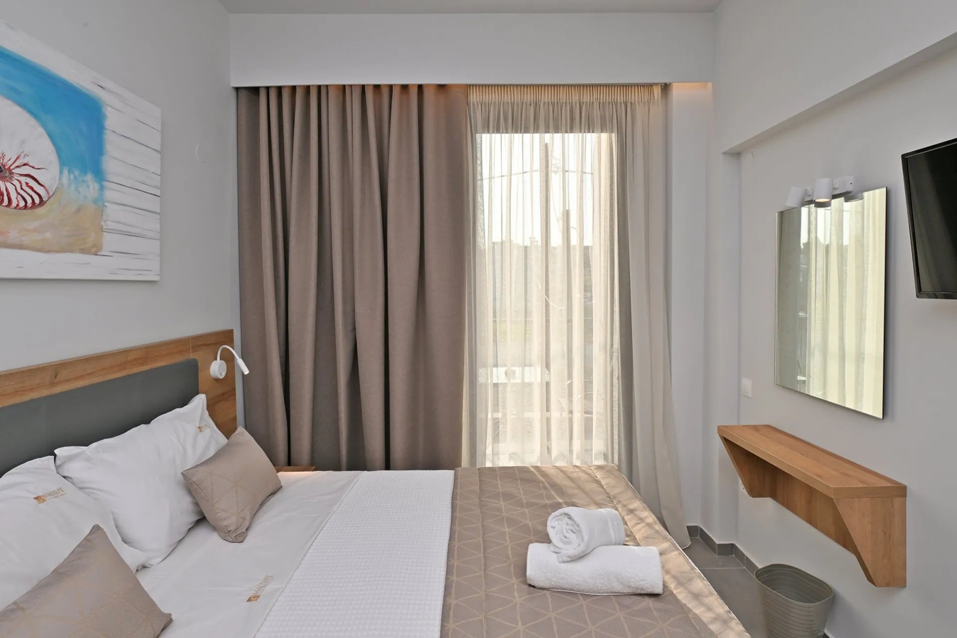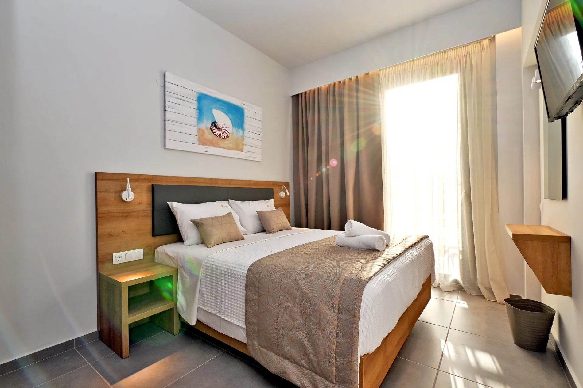 Bright and comfortable first-floor double room with a city view. Guests can choose between a king-size bed or two single beds. The room features modern furnishings, air conditioning, a flat-screen TV, a bathroom with shower, free Wi-Fi, a safe, tea and coffee facilities, electronic locks, and a private balcony. A baby cot is available upon request at no extra charge.