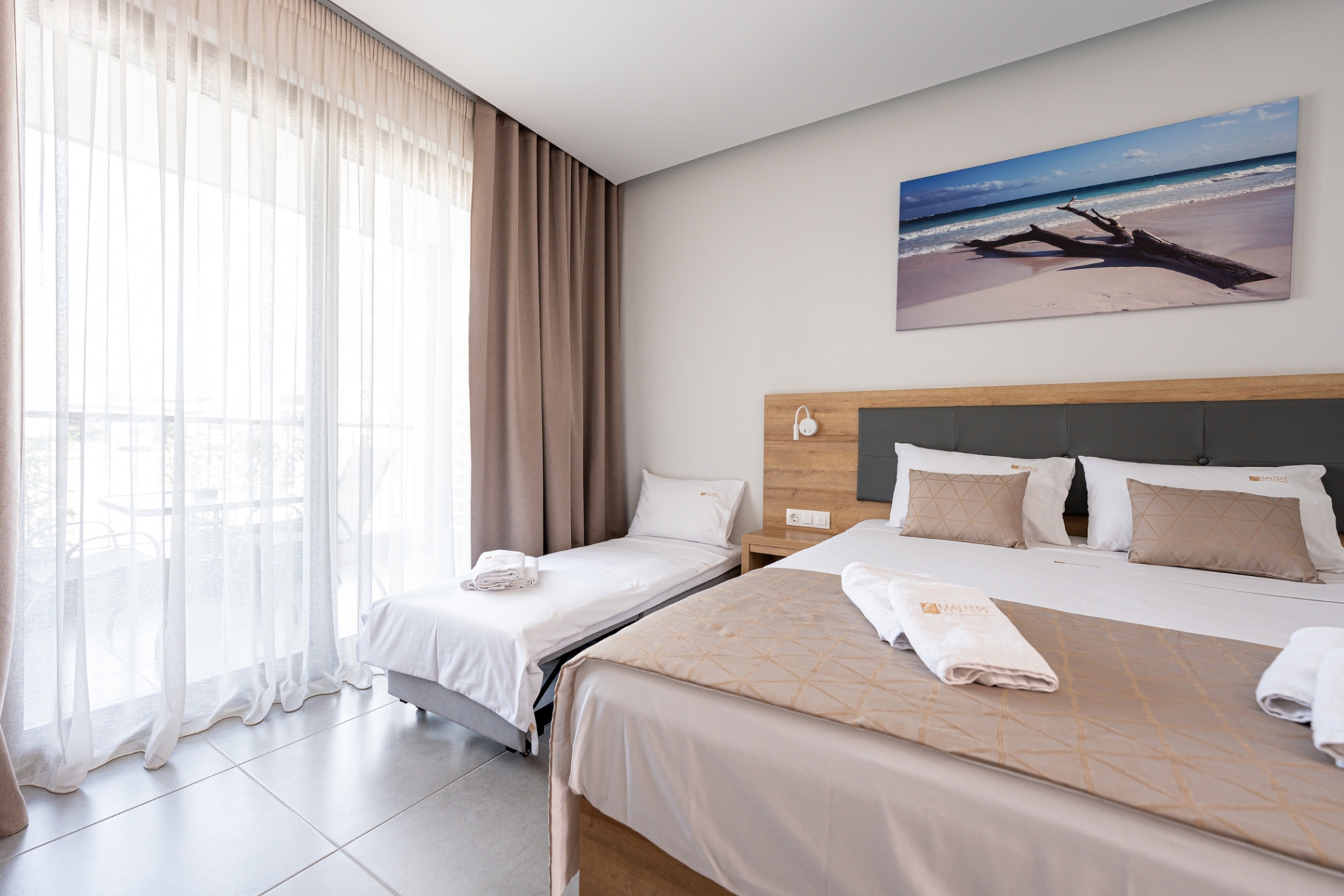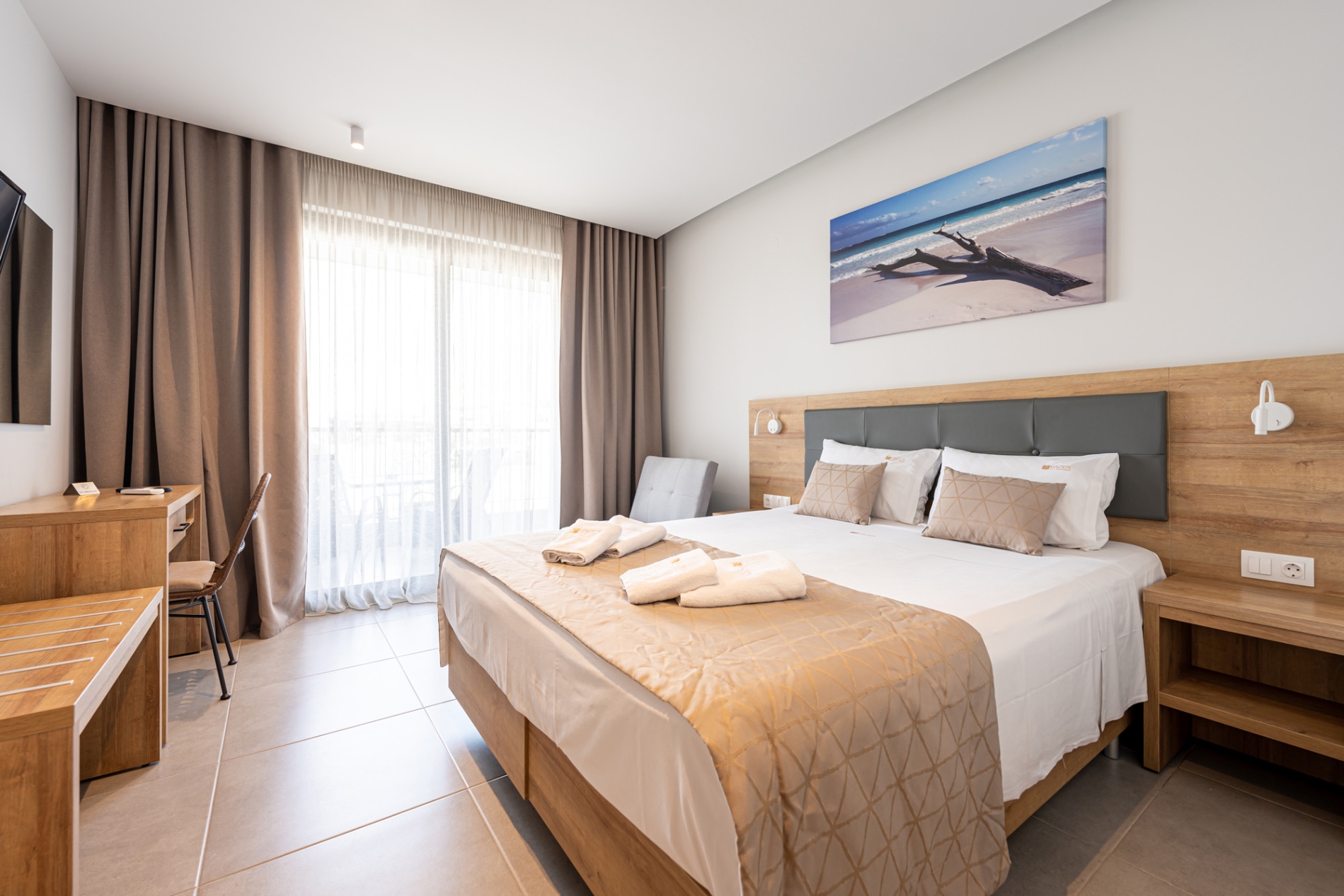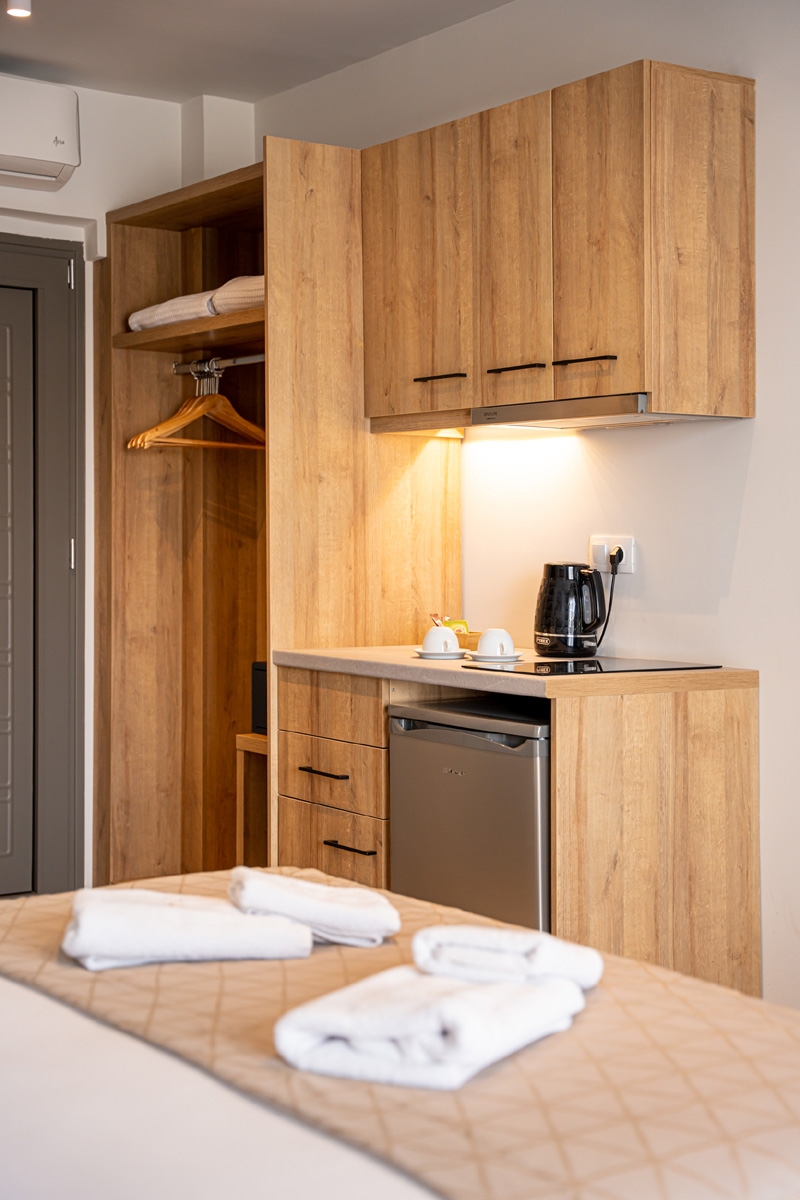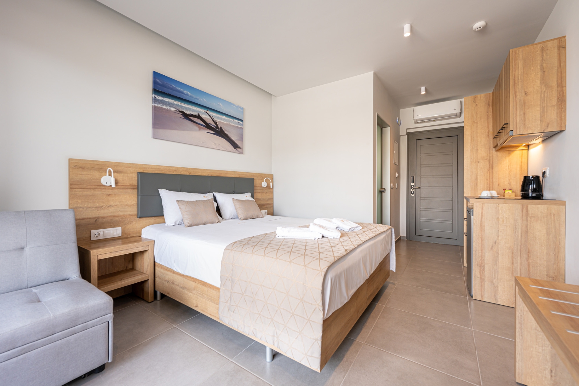 Bright and comfortable ground-floor double room with a pool view. Guests can select a king-size bed or two single beds, with a sofa bed available for children aged 3-11 years at no extra charge. The room features modern furnishings, air conditioning, a flat-screen TV, a bathroom with shower, free Wi-Fi, a safe, tea and coffee facilities, electronic locks, and a private balcony. A baby cot is also available upon request at no extra cost.