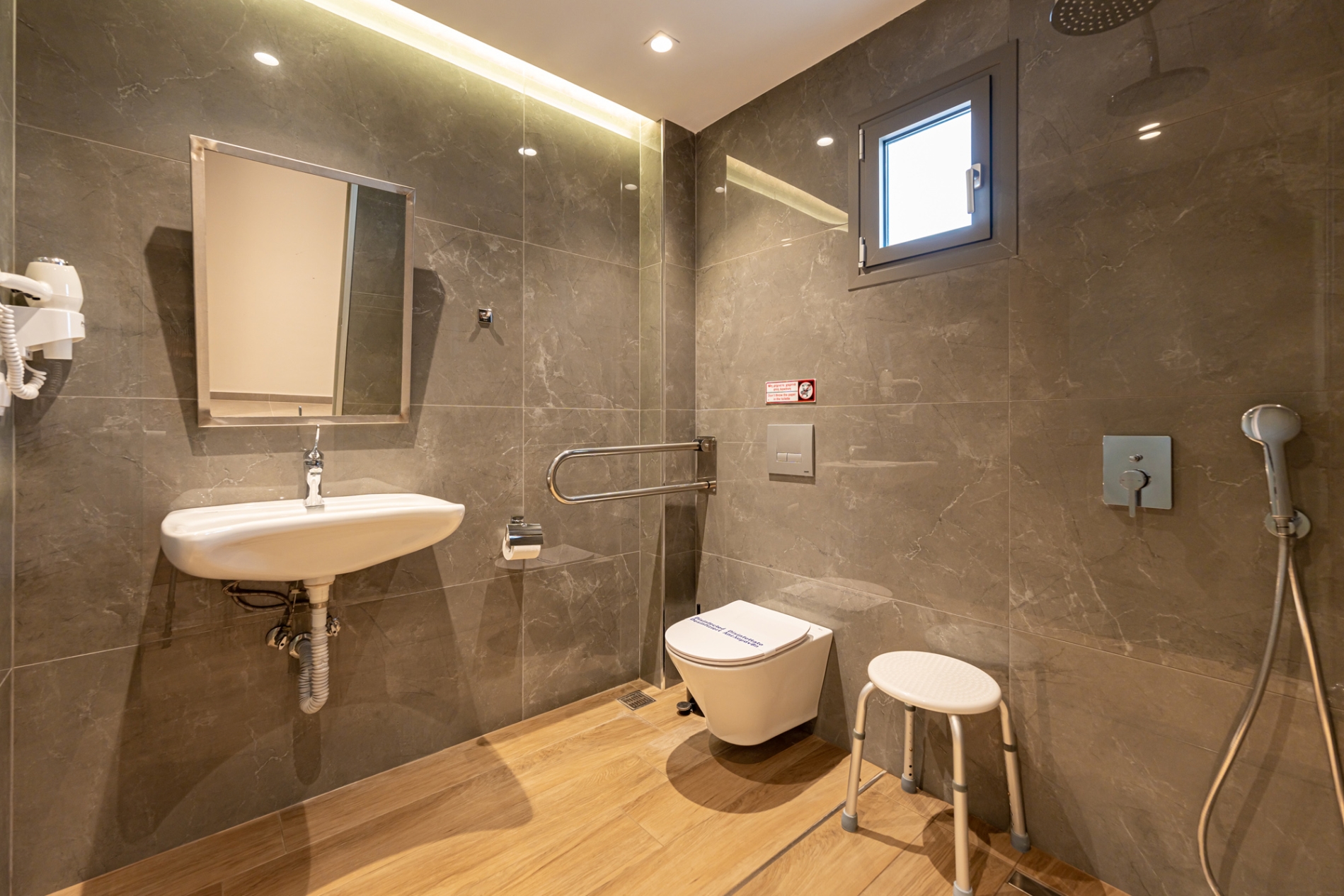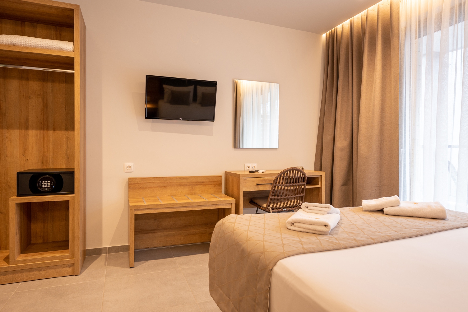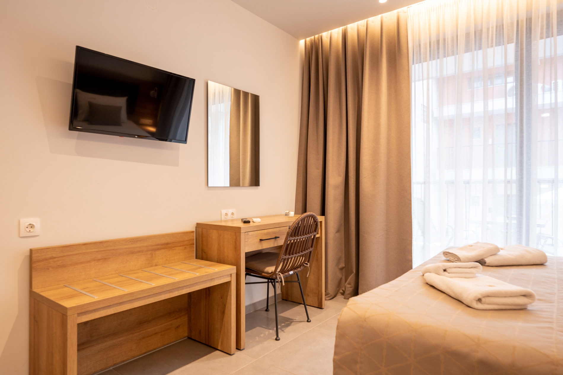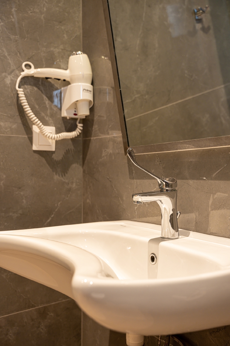Spacious and comfortable ground-floor double room with a city view, specially designed for guests with mobility needs. The room offers a queen-size bed and features modern furnishings, air conditioning, a flat-screen TV, a bathroom with shower, free Wi-Fi, a safe, tea and coffee facilities, electronic locks, and a private balcony. A baby cot is available upon request at no extra charge.