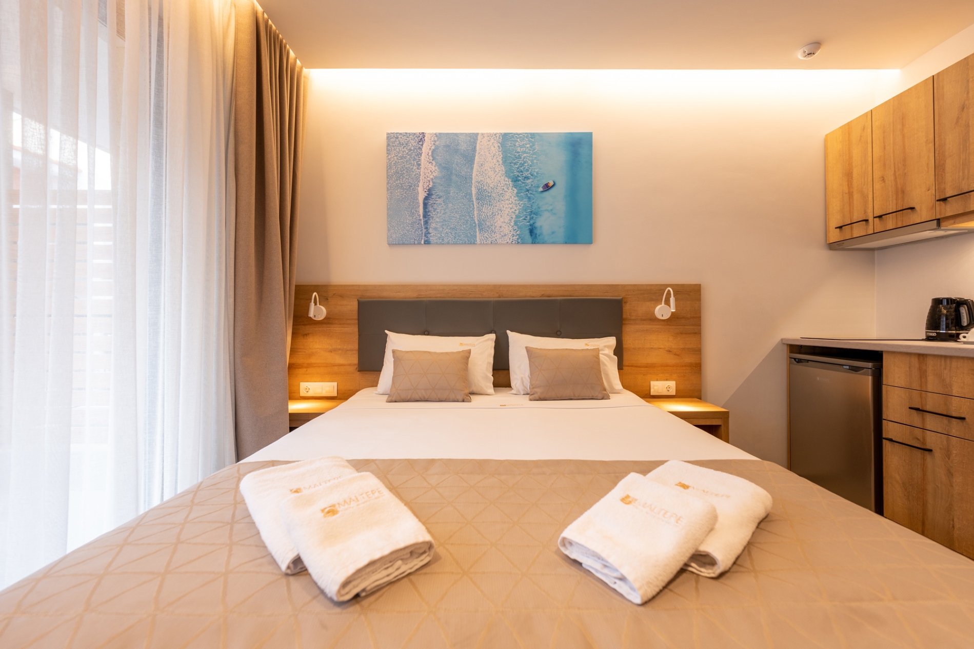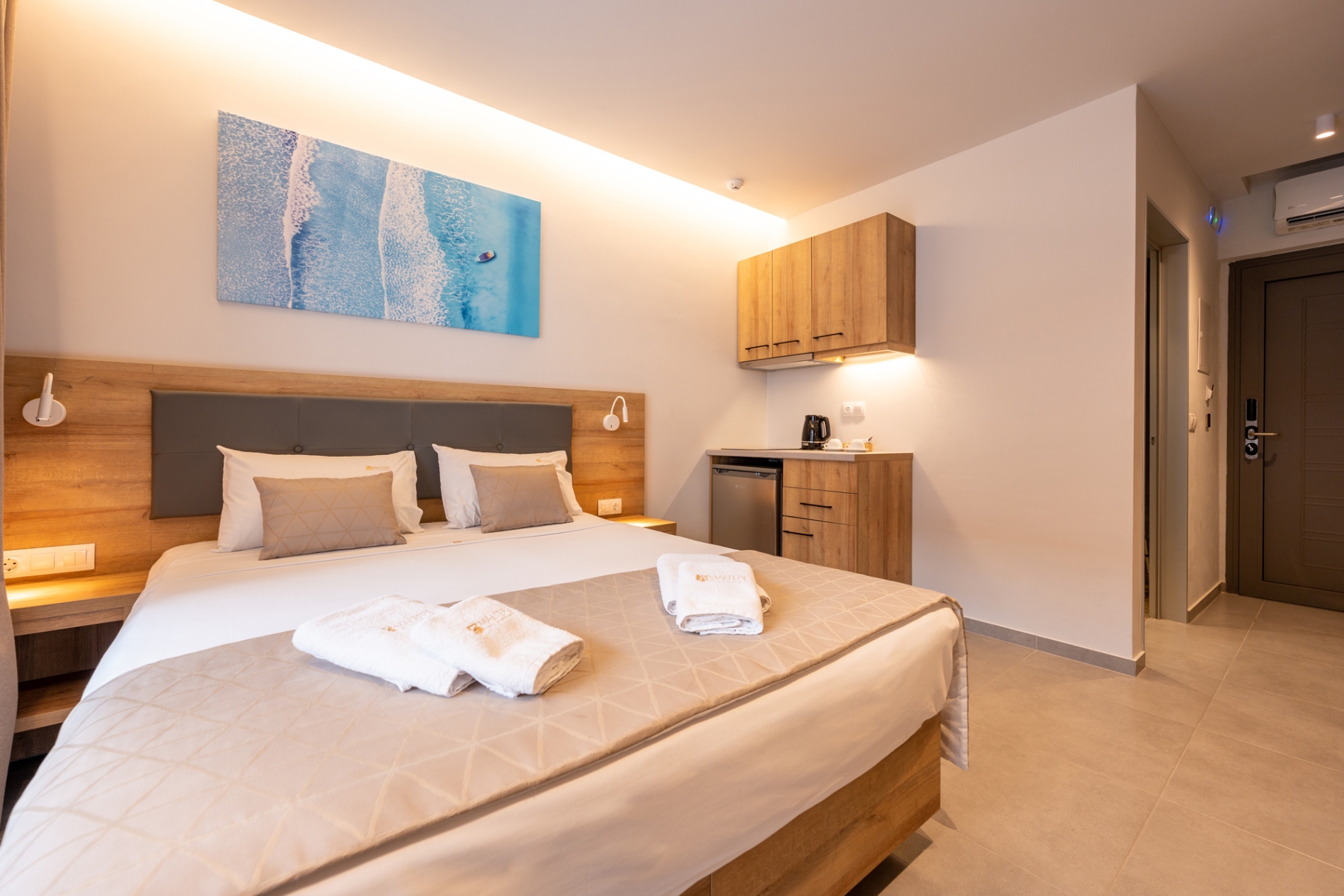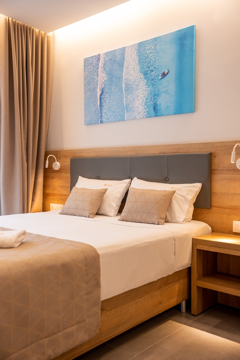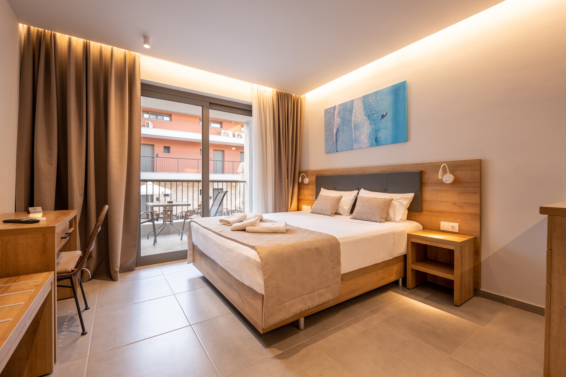 Spacious and comfortable ground-floor double room with a city view, specially designed for guests with mobility needs. The room offers a queen-size bed and features modern furnishings, air conditioning, a flat-screen TV, a bathroom with shower, free Wi-Fi, a safe, tea and coffee facilities, electronic locks, and a private balcony. A baby cot is available upon request at no extra charge.